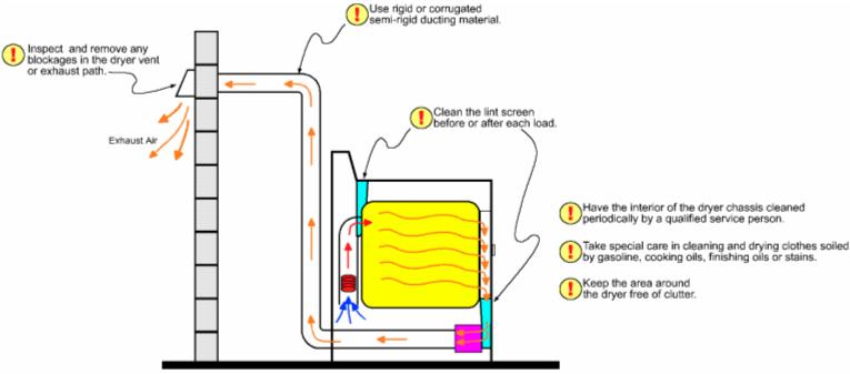 Fires can occur when lint builds up in the dryer or in the exhaust duct. Lint can block the flow of air, cause excessive heat build-up, and result in a fire in some dryers.